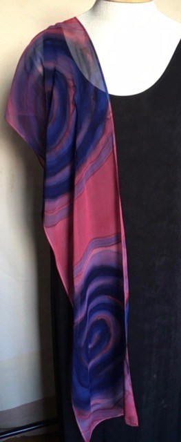 Gorgeous lightweight flowing chiffon scarf with spiral design in shades of reds/blues.  Perfect multi-seasonal casual or dressy accessory.