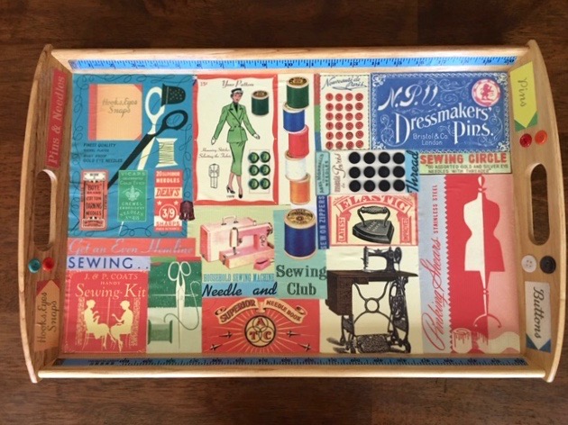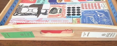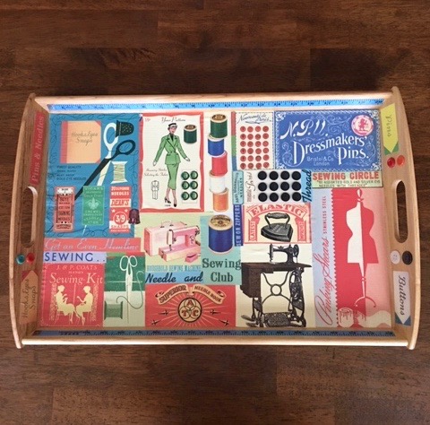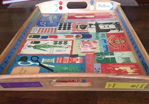 Category: Home Decor Tags: collaged tray, gift, hand made, one-of-a-kind, serving tray, sewing, vintage paper, vintage sewing paper