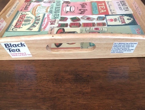 Category: Home Decor Tags: collaged tray, gift, hand made, one-of-a-kind, serving tray, tea themed, vintage paper, vintage tea