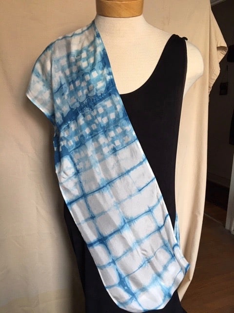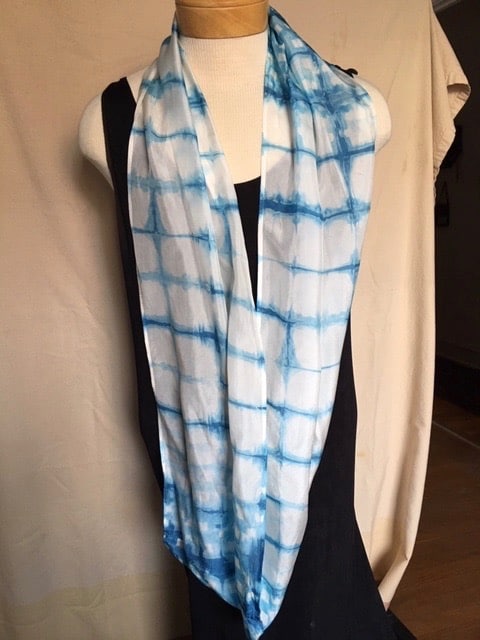Categories: Shibori Scarves, Silk Scarves Tags: handpainted shawl, indigo, infinity scarf, rayon scarf, scarf, shibori