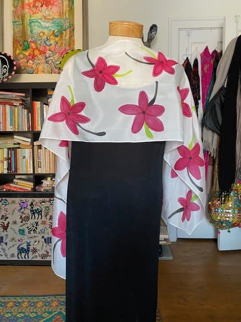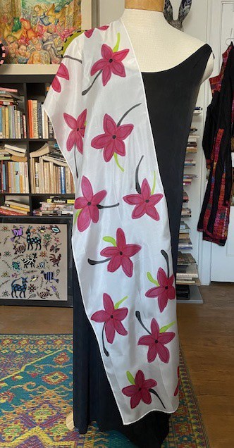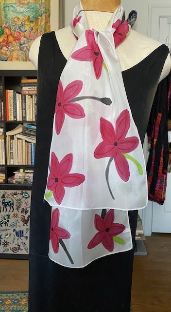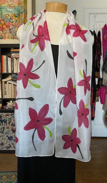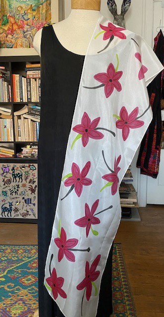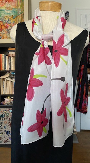 You are here: Home / Silk Scarves / Longer Painted Flower Power Scarf Pink