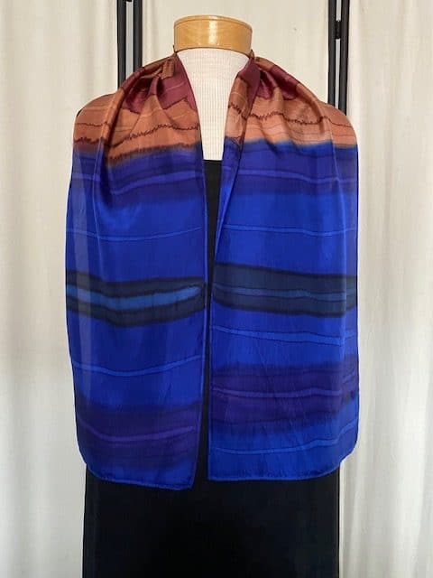 Category: Silk Scarves Tags: blues, brown, handpainted silk scarf, rust, siik, silk scarf